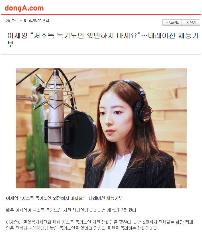 [스포츠동아] 이세영 “저소득 독거노인 외면하지 마세요”…내레이션 재능기부