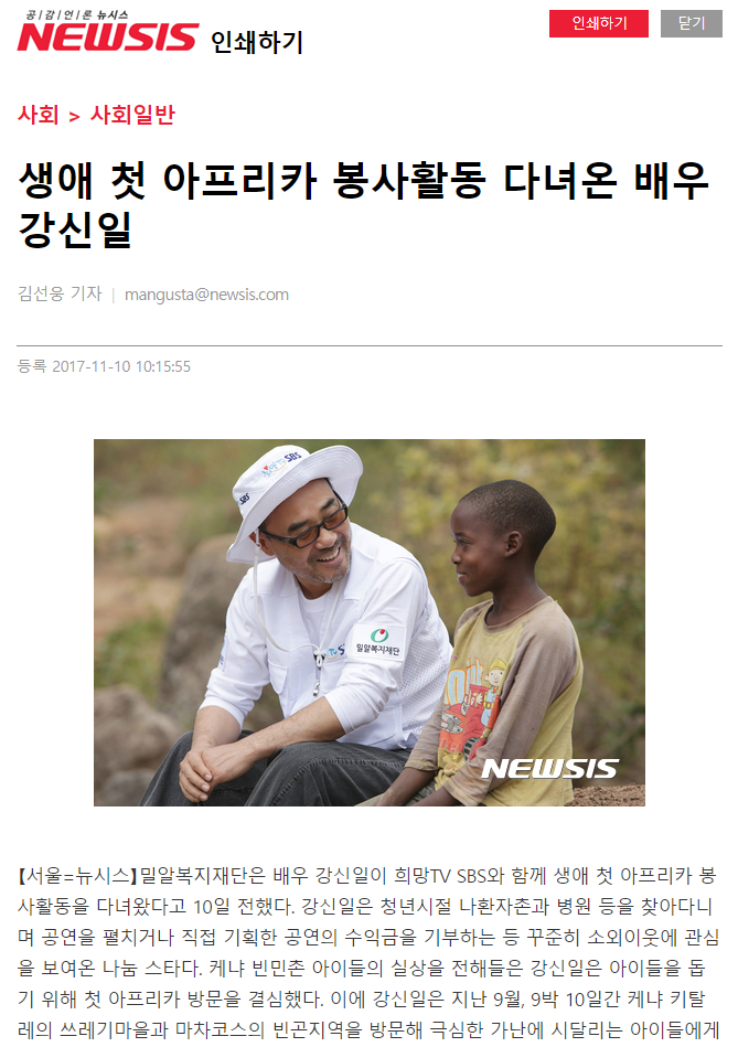 [기독교한국신문] 밀알, 배우 강신일, 희망TV SBS 아프리카 봉사활동