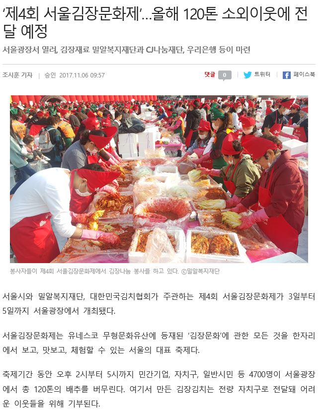 [기독인뉴스] 밀알복지재단 서울시와 함께 제4회 서울김장문화제 주관