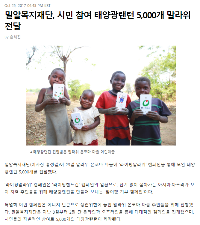 [한국인권신문] 밀알복지재단, 시민이 만든 태양광랜턴 5천개 말라위에 전달
