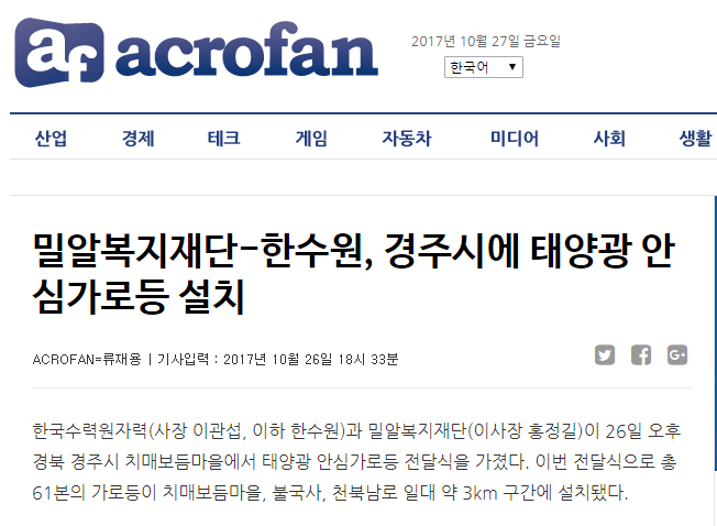 [아크로팬] 밀알복지재단-한수원, 경주시에 태양광 안심가로등 설치