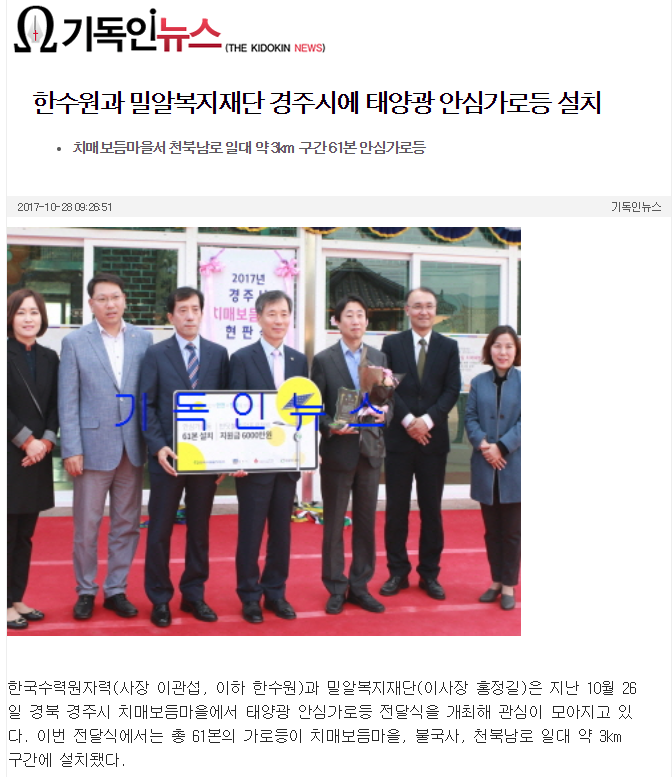[기독인뉴스] 한수원과 밀알복지재단 경주시에 태양광 안심가로등 설치