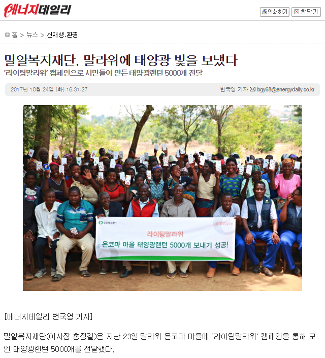 [에너지데일리] 밀알복지재단, 말라위에 태양광 빛을 보냈다