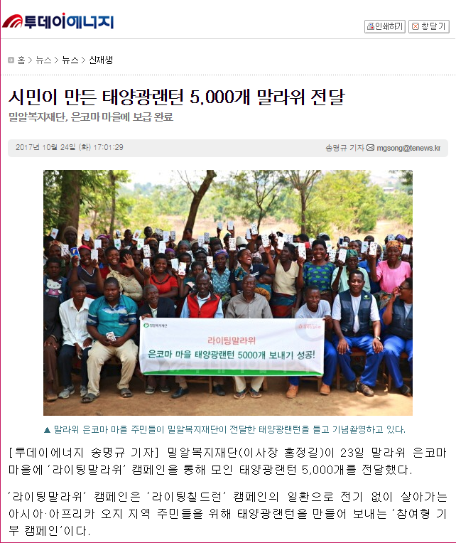 이전 [에너지데일리] 밀알복지재단, 말라위에 태양광 빛을 보냈다 다음 [아크로팬] 밀알복지재단, 시민들이 만든 태양광랜턴 5,000개 말라위에 전달