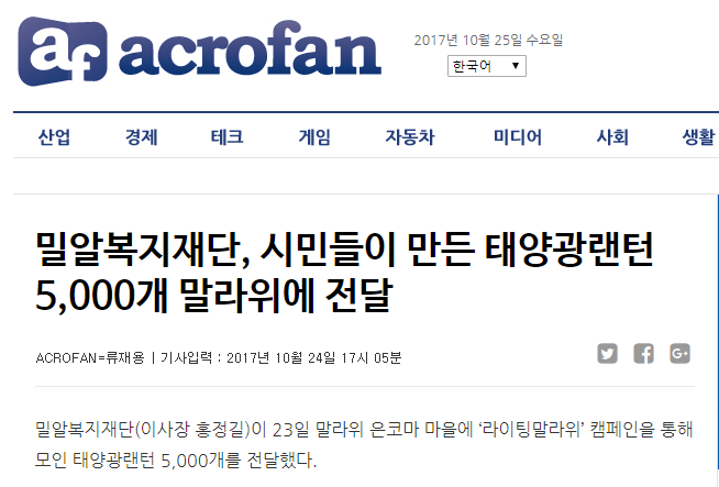 [아크로팬] 밀알복지재단, 시민들이 만든 태양광랜턴 5,000개 말라위에 전달