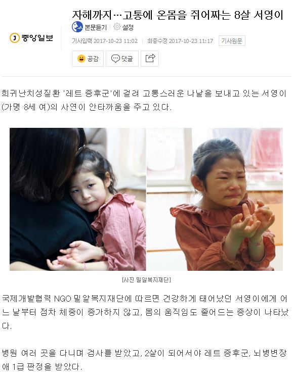 [인사이트] "희귀난치성 걸려 고통 속에 살고 있는 8살 서영이를 도와주세요"