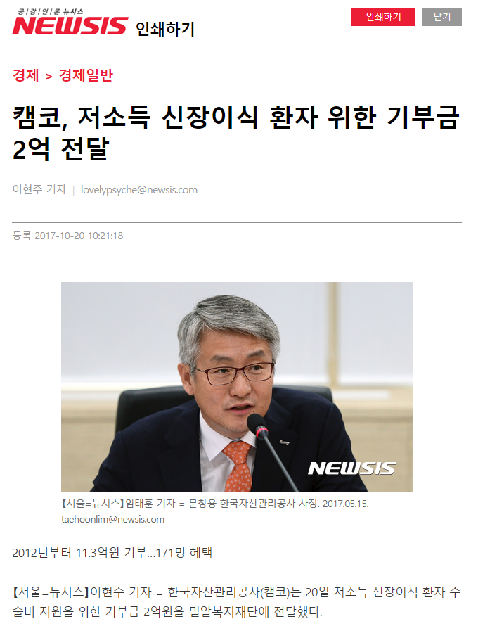 [NSP통신] 캠코, 저소득 신장이식 환자 위해 2억 기부