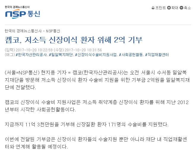 [NSP통신] 캠코, 저소득 신장이식 환자 위해 2억 기부