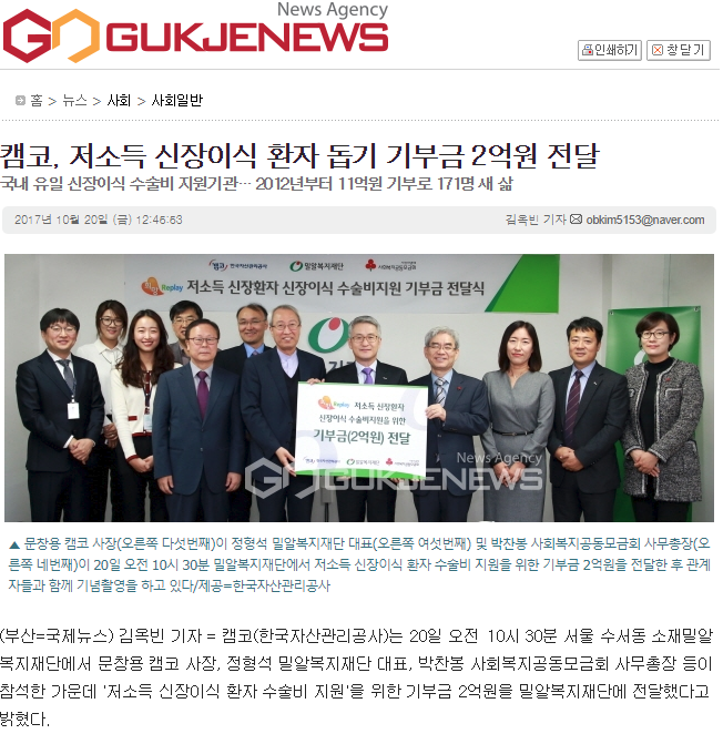 [국제뉴스] 캠코, 저소득 신장이식 환자 돕기 기부금 2억원 전달