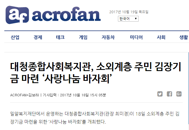 [아크로팬] 대청종합사회복지관, 소외계층 주민 김장기금 마련 ‘사랑나눔 바자회’