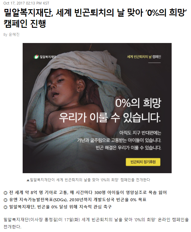 [크리스천투데이] 밀알복지재단, 세계 빈곤퇴치의 날 맞아 ‘0%의 희망’ 캠페인 진행