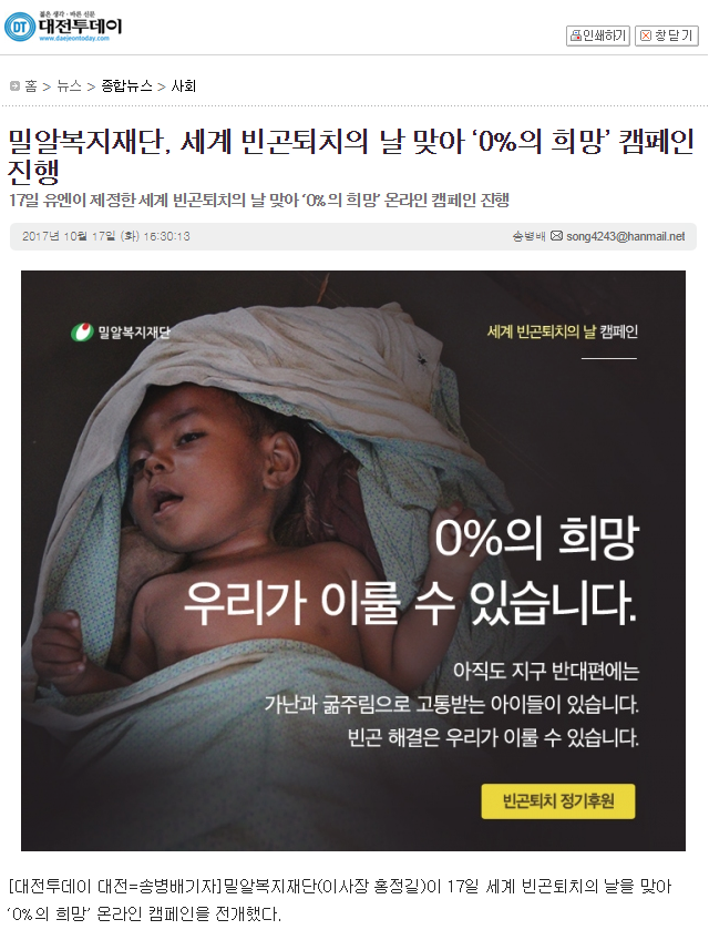 [대전투데이] 밀알복지재단, 세계 빈곤퇴치의 날 맞아 ‘0%의 희망’ 캠페인 진행