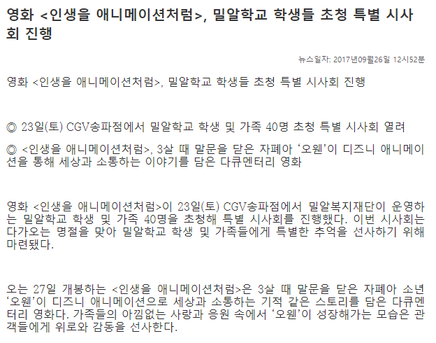 [한국사진방송] 영화 <인생을 애니메이션처럼>, 밀알학교 학생들 초청 특별 시사회 진행