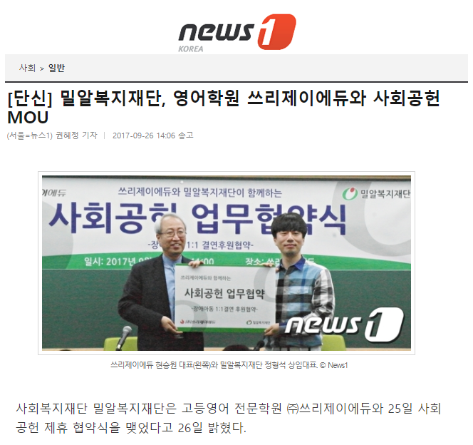 [뉴스1] 밀알복지재단, 영어학원 쓰리제이에듀와 사회공헌 MOU