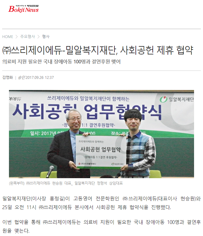 [복지연합뉴스] ㈜쓰리제이에듀-밀알복지재단, 사회공헌 제휴 협약