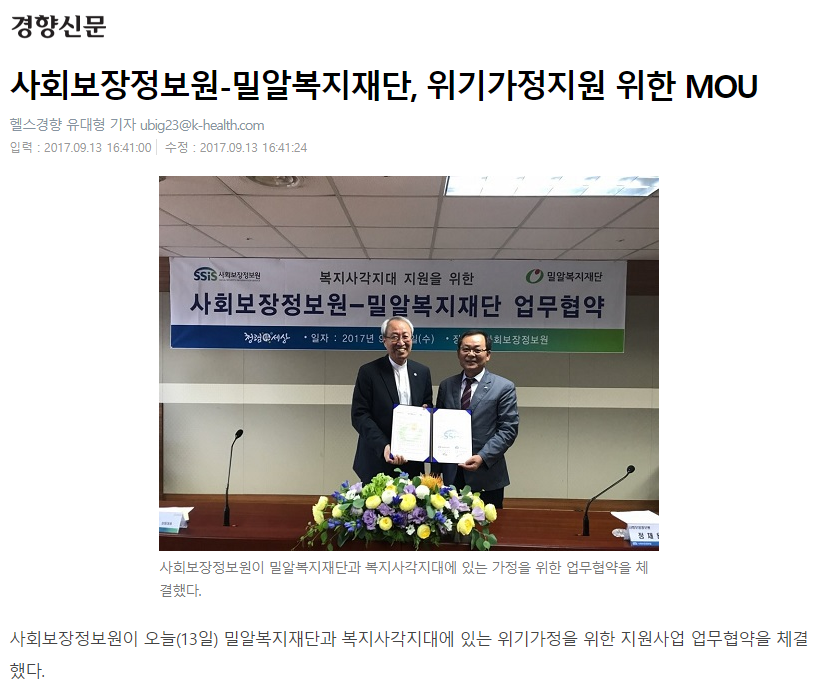 [경향신문] 사회보장정보원-밀알복지재단, 위기가정지원 위한 MOU