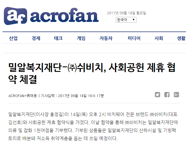 [아크로팬] 밀알복지재단-㈜쉬비치, 사회공헌 제휴 협약 체결