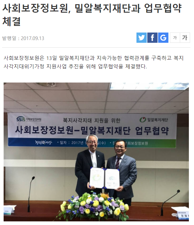 [전자신문] 사회보장정보원, 밀알복지재단과 업무협약 체결