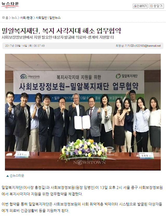 [뉴스타운] 밀알복지재단, 복지 사각지대 해소 업무협약