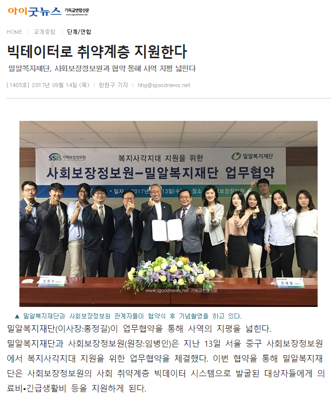 이전 [대한뉴스] 사회보장정보원 - 밀알복지재단 업무협약 체결 다음 [한국인권신문] 밀알복지재단-사회보장정보원, 복지 사각지대 대상자 지원 사업 공동 추진