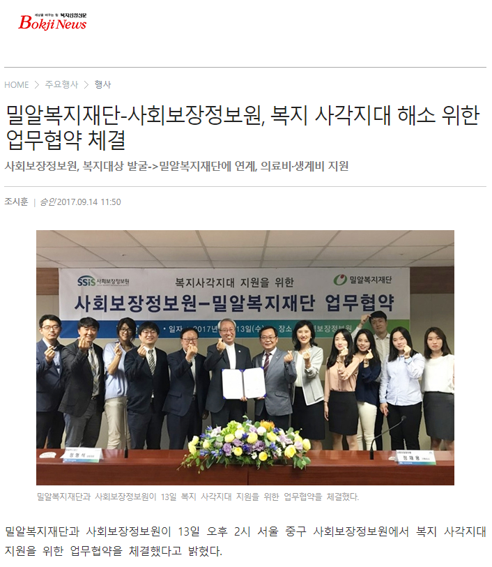 [한국인권신문] 밀알복지재단-사회보장정보원, 복지 사각지대 대상자 지원 사업 공동 추진