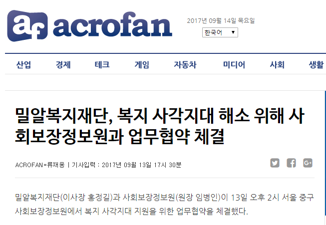 [아크로팬] 밀알복지재단, 복지 사각지대 해소 위해 사회보장정보원과 업무협약 체결