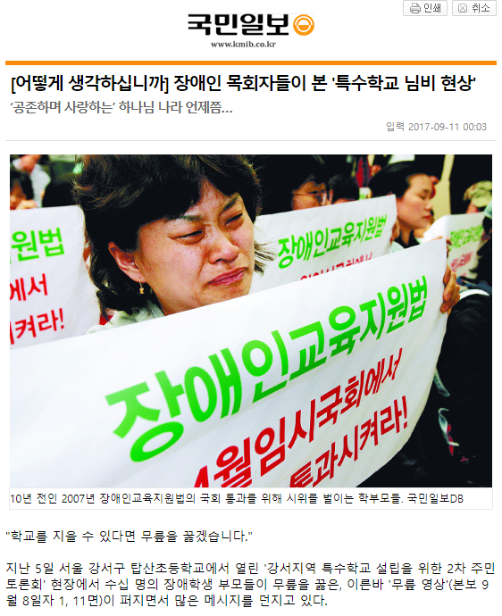 [국민일보] [어떻게 생각하십니까] 장애인 목회자들이 본 '특수학교 님비 현상'