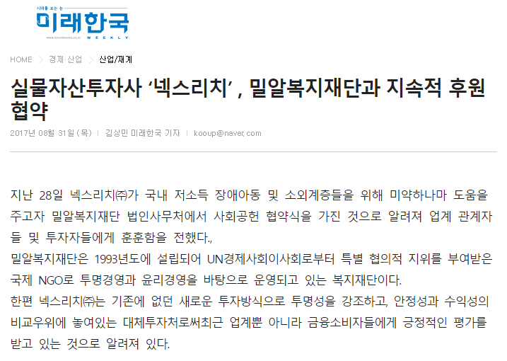 [미래한국] 실물자산투자사 ‘넥스리치’ , 밀알복지재단과 지속적 후원 협약