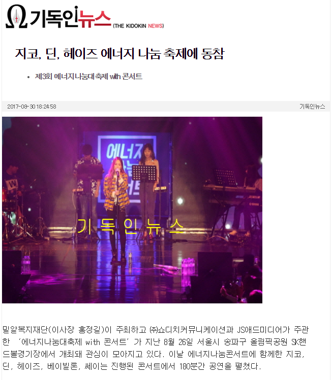[기독인뉴스] 지코, 딘, 헤이즈 에너지 나눔 축제에 동참