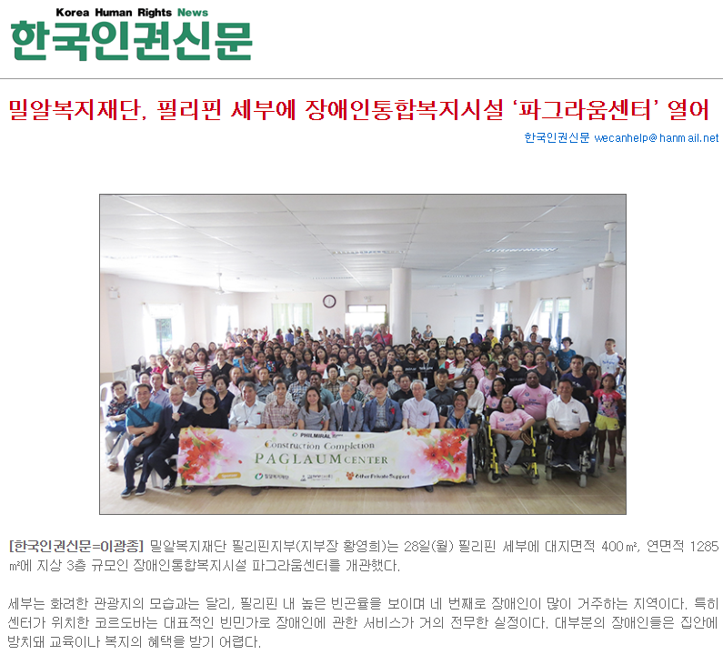 [한국인권신문] 밀알복지재단, 필리핀 세부에 장애인통합복지시설 ‘파그라움센터’ 열어