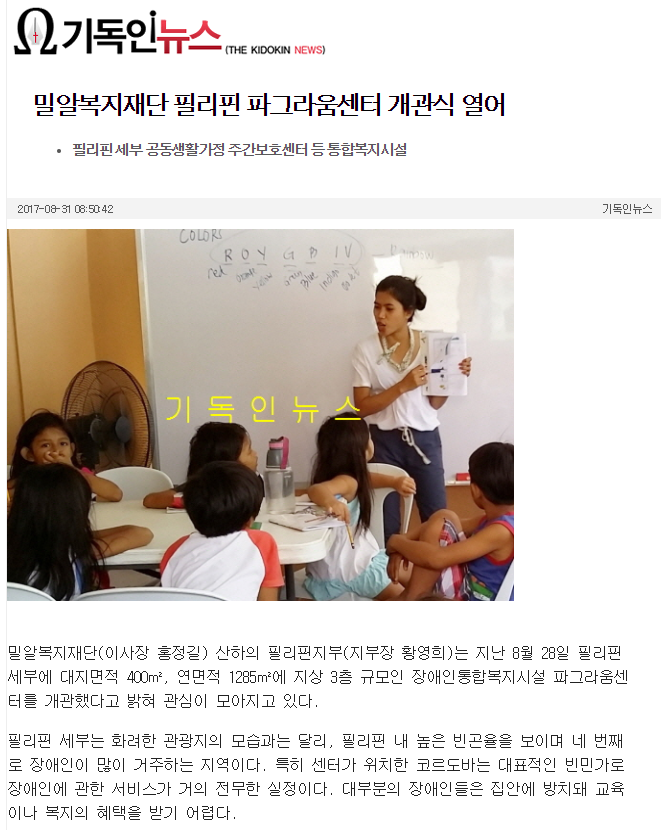 [기독인뉴스] 밀알복지재단 필리핀 파그라움센터 개관식 열어