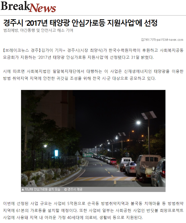 [브레이크뉴스] 경주시 ‘2017년 태양광 안심가로등 지원사업’에 선정