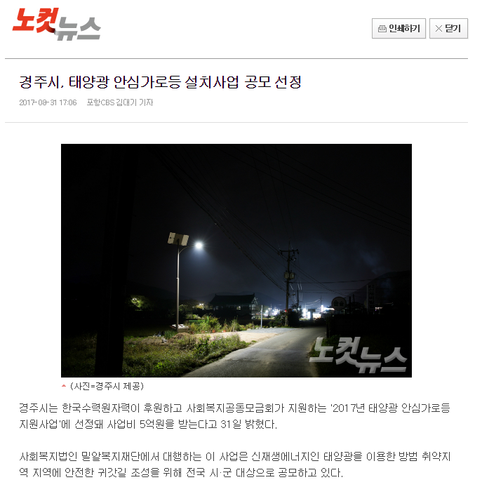 [노컷뉴스] 경주시, 태양광 안심가로등 설치사업 공모 선정