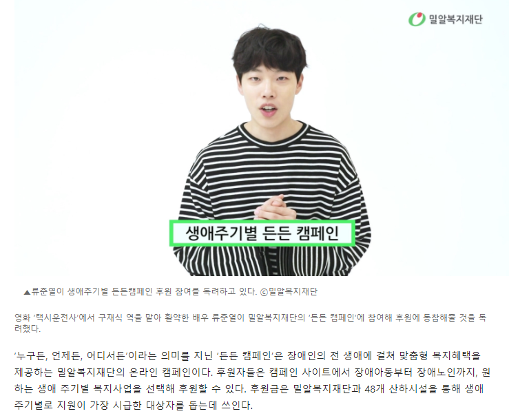 [기독교한국신문] 배우 류준열, 밀알복지재단 ‘든든 캠페인’ 참여