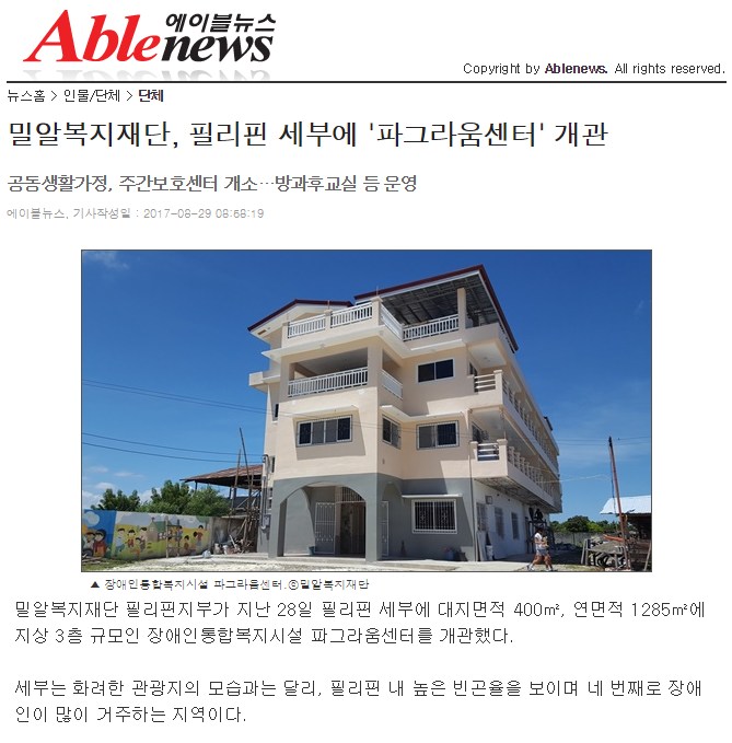 [에이블뉴스] 밀알복지재단, 필리핀 세부에 '파그라움센터' 개관