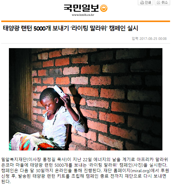 [국민일보] 태양광 랜턴 5000개 보내기 ‘라이팅 말라위’ 캠페인 실시
