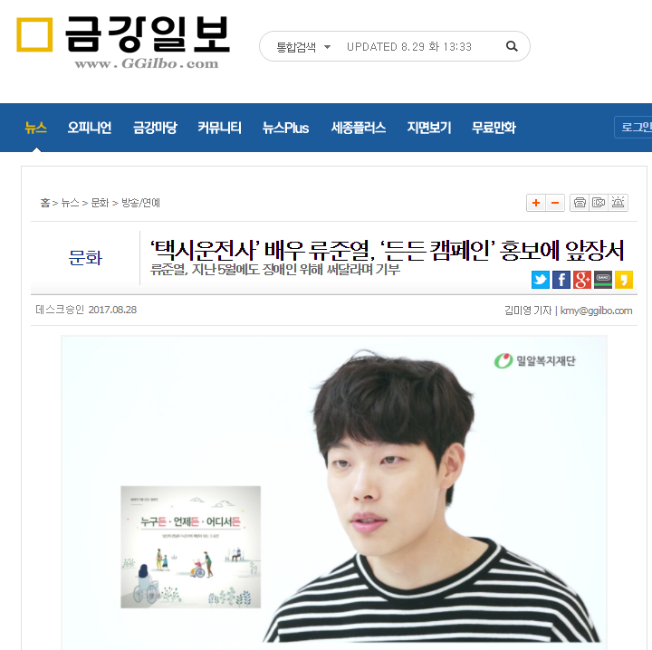 [금강일보] '택시운전사’ 배우 류준열, ‘든든 캠페인’ 홍보에 앞장서