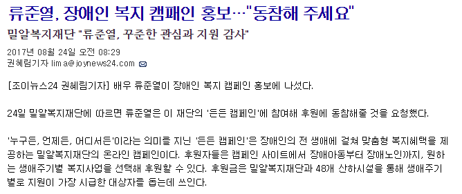 [에이블뉴스] 훈남 배우 류준열, 장애인 돕기 ‘든든 캠페인’ 홍보