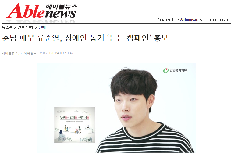 [에이블뉴스] 훈남 배우 류준열, 장애인 돕기 ‘든든 캠페인’ 홍보