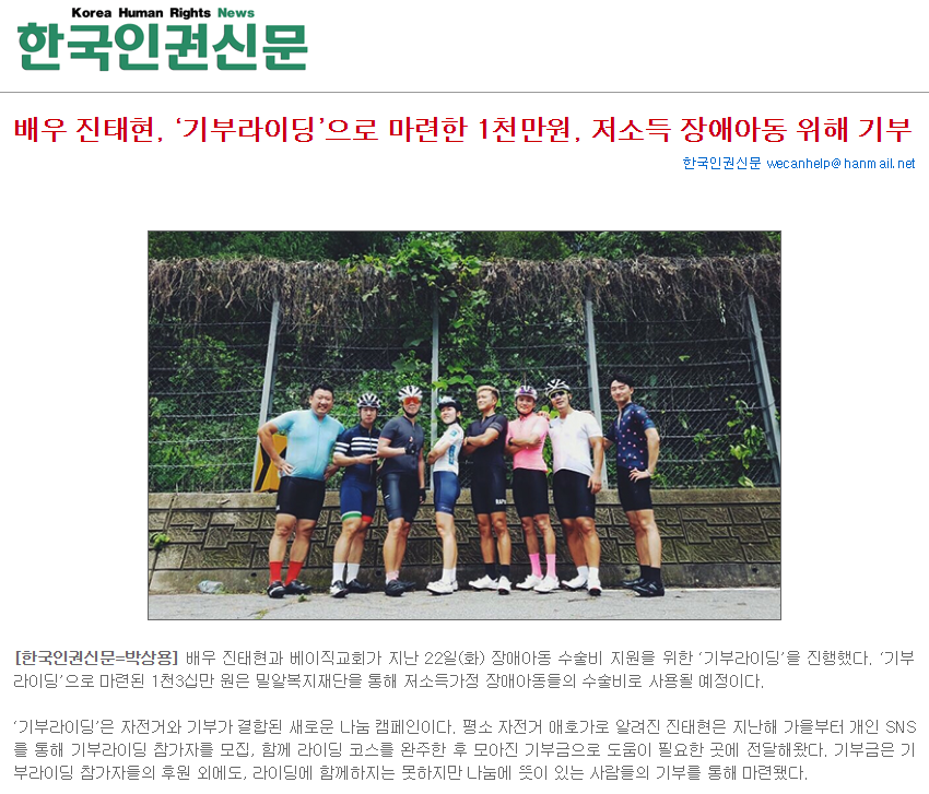 [한국인권신문] 배우 진태현, ‘기부라이딩’으로 마련한 1천만원, 저소득 장애아동 위해 기부