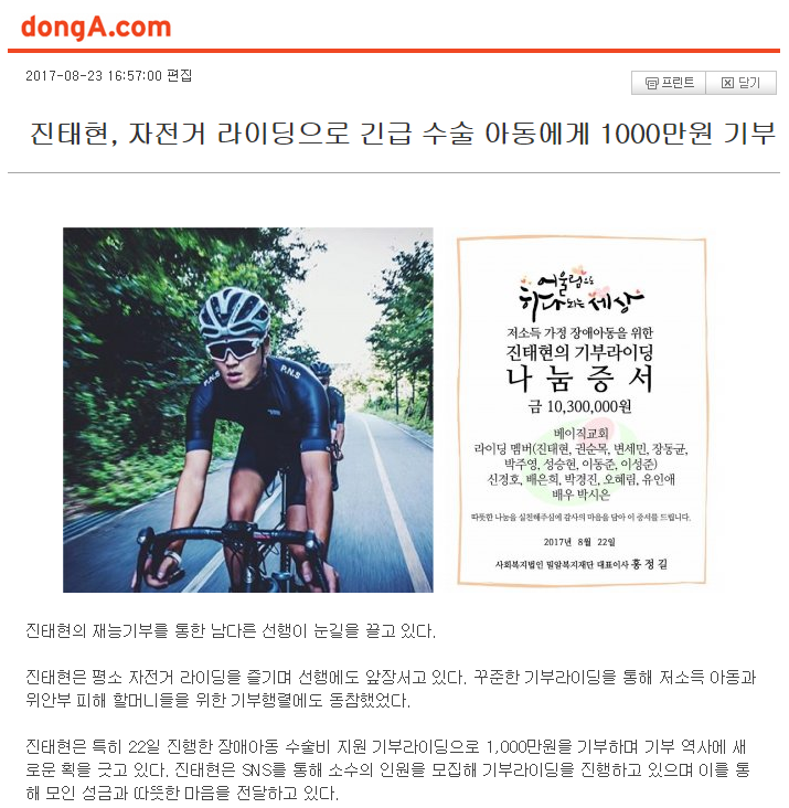 [매일경제] 진태현, 1000만원 라이딩 기부