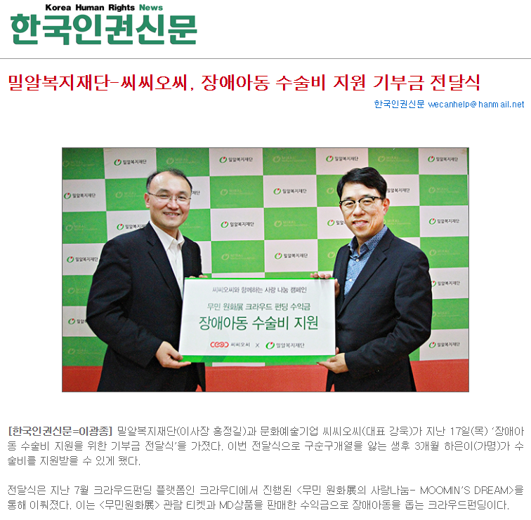 [한국인권신문] 밀알복지재단-씨씨오씨, 장애아동 수술비 지원 기부금 전달식
