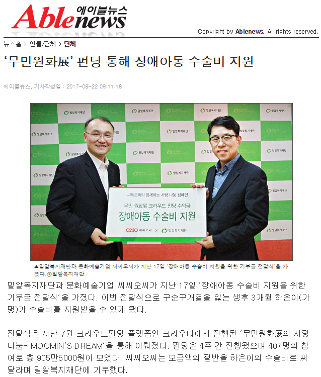 [이뉴스투데이] 씨씨오씨, 무민원화전 펀딩 통해 밀알복지재단에 장애아동 수술비 기부
