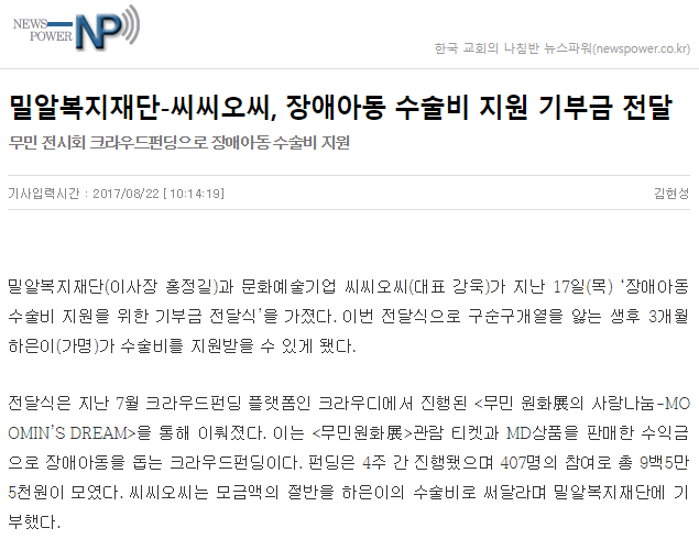 [뉴스파워] 밀알복지재단-씨씨오씨, 장애아동 수술비 지원 기부금 전달