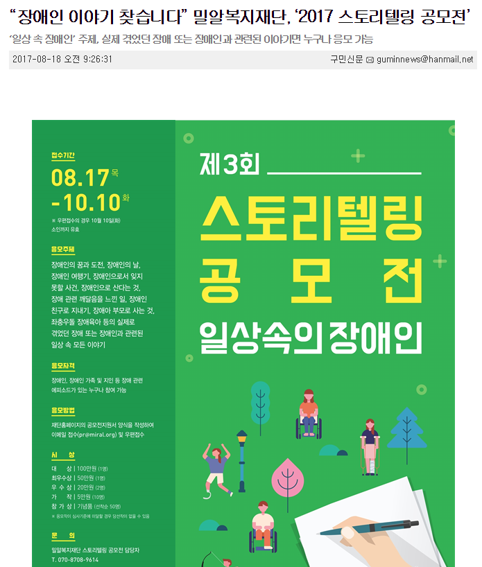 [서울구민신문] “장애인 이야기 찾습니다” 밀알복지재단, ‘2017 스토리텔링 공모전’