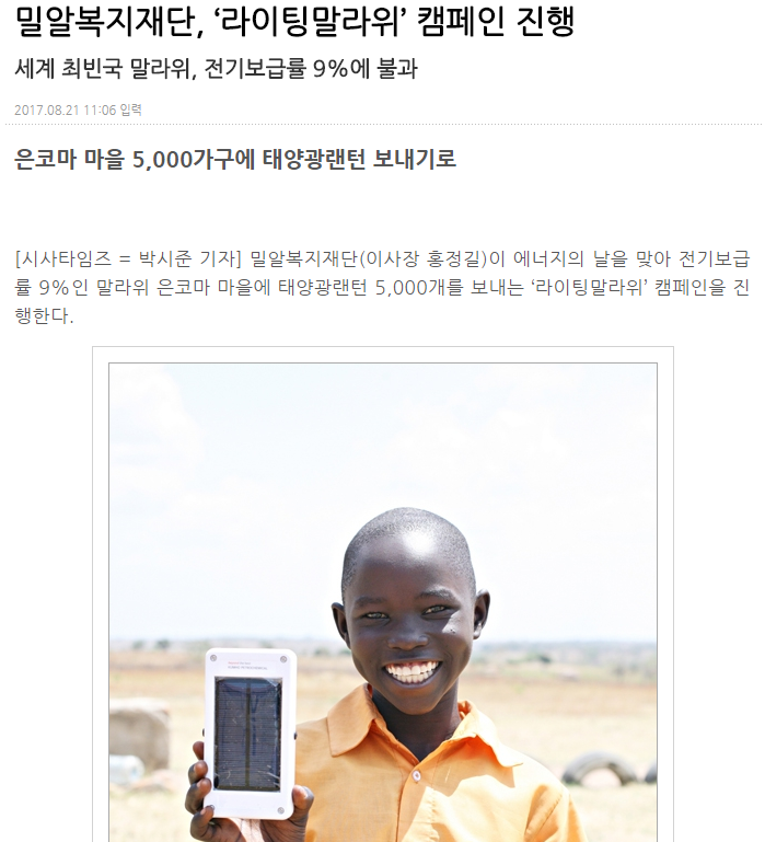 [시사타임즈] 밀알복지재단, ‘라이팅말라위’ 캠페인 진행