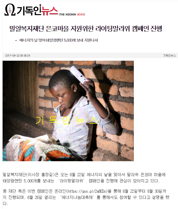 [기독인뉴스] 밀알복지재단 은코마 마을 지원위한 라이팅말라위 캠페인 진행