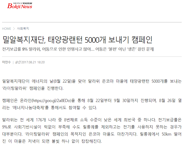 [복지연합신문] 밀알복지재단, 태양광랜턴 5000개 보내기 캠페인