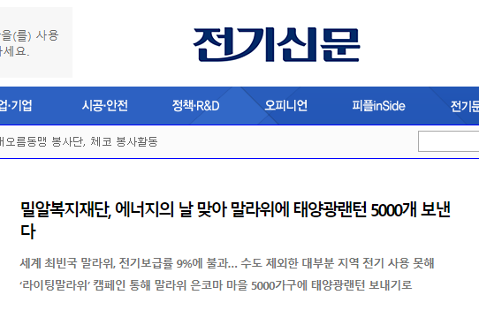 [전기신문] 밀알복지재단, 에너지의 날 맞아 말라위에 태양광랜턴 5000개 보낸다
