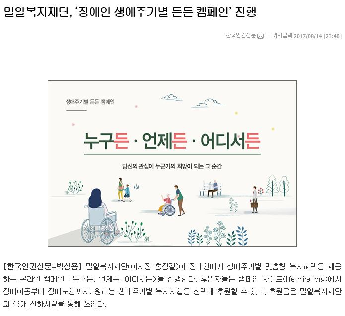 [한국인권신문] 밀알복지재단, ‘장애인 생애주기별 든든 캠페인’ 진행